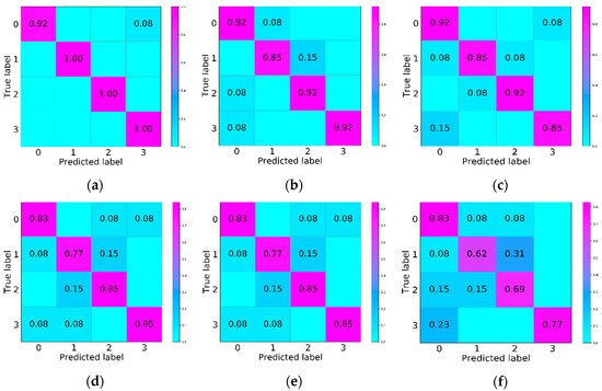 Confusion matrices of different methods: (a) CNN-LSTM, (b) support vector machines (SVM), (c) Resnet18, (d) back propagation neural networks (BPNN), (e) CNN, and (f) LSTM.