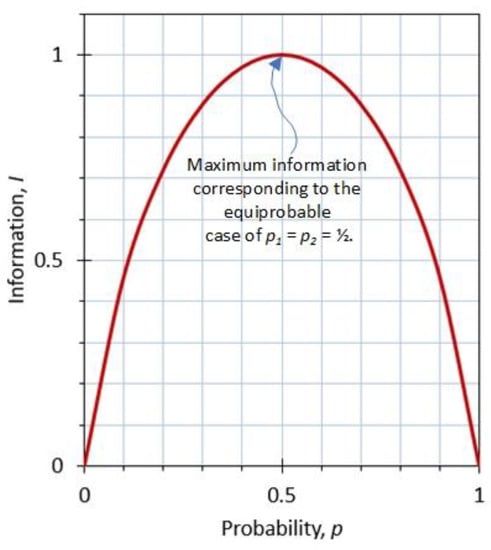 The negative sign in this expression should not cause any concern since probabilities associated with a system or an event are always positive numbers in the range of 0 ≤ p ≤ 1, and logarithms of positive numbers less that unity are always negative. The two negative signs cancel each other out and ensure that information is a positive quantity. Here, a person is equally free to choose one of the two alternative messages.