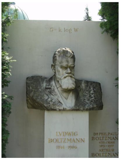 Boltzmann’s tombstone engraved with his famous formula S = k log W (In the case of evenly distributed probabilities over all the occupied states of a system, entropy is a constant multiple of the logarithm of the number of the occupied states, W). (Credit: Tom Schneider, https://alum.mit.edu/www/toms/images/boltzmann (accessed on 1 June 2021); public domain.).