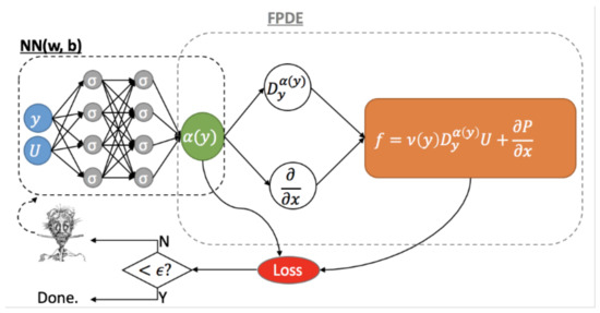 with , and the fractional order is obtained by training fPINN with and Equation (24). The corresponding loss functional error is defined as follows