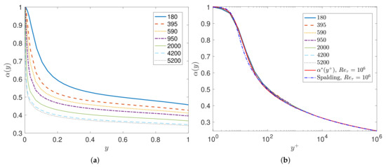 We first consider turbulent channel flow for which DNS data are available up to [22]. Here, we use the FD scheme with points to solve the aforementioned inverse problem for the channel flow at a given Reynolds number . Solving for , which uniquely determines the Reynolds stresses, Figure 2a depicts the profiles of the fractional order for different as a function of the non-dimensional distance from the wall . We see a strong dependence of on ; however, if we re-plot all data in terms of the viscous wall units, i.e., we see a collapse of all results into a single universal curve, as shown in Figure 2b. Moreover, we employ the empirical Spalding formula [23] for in order to extend the results up to high , and again we obtain a similar universal scaling with the exception of low for which the Spalding formula is known to be somewhat inaccurate. We fit the fractional order using these numerical results to obtain the fractional order in wall units as follows