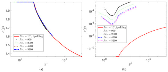 where and with , are constants. This is a remarkable result as it goes beyond the logarithmic profile and seamlessly connects the viscous sublayer with the buffer zone, the logarithmic profile, and the wake region. Although at first it appears to be a perfect fitting exercise, it has important consequences due to the nonlocal interpretation of the fractional derivative involved, i.e., it shows that nonlocality is stronger away from the wall and at high Reynolds numbers. Using the same data for , we show that the alternative model VFM-II with also leads to the same type of universality (Figure 3). However, unlike the aforementioned VFM-I, we are unable to obtain an explicit formula for , relating it to the Reynolds number as in the first model (i.e., ); instead, we can compute it numerically from the DNS data of turbulent channel flow. As shown in Section 3, this alternative fractional model also exhibits a universal scaling if plotted in terms of wall units, with the lowest value of .