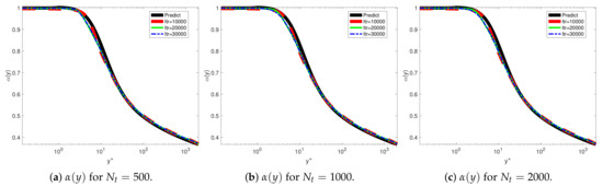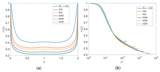 In this subsection, we focus on the two-sided models. Solving for , which uniquely determines the total shear stresses, Figure 10 plots the profiles of the fractional order for different as a function of the non-dimensional distance between the two walls . We see a strong dependence of of , which is the same conclusion as for the previous variable fractional model. Furthermore, we re-plot all data in terms of the viscous wall units, i.e., , and we see an approximate collapse of all results into a single universal curve in the half-plane excluding the wake region (i.e., near the centerline), as shown in Figure 10.