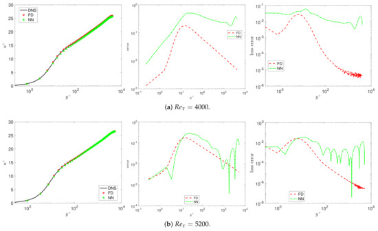 We can compare the predicted Reynolds stresses to their counterparts, from DNS data for turbulent channel flow, and using the corresponding viscous shear stress denoted by , where denotes the mean velocity from the DNS database. In Figure 9, we plot the predicted and DNS profiles for Reynolds numbers and the corresponding pointwise error. We can observe that they are all in very good agreement. The numerical results of the mean velocities and shear stresses for all Reynolds number match very well with the DNS data; here, we only show the high Reynolds number cases due to space limitations.