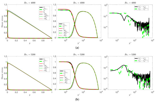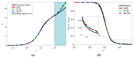 VFM-I: Accurate prediction of the shear stress at (a,b) in outer units and wall units: (left) outer scaling; (middle) wall units scaling; (right) pointwise error of the wall shear stress. Here, denotes the wall shear stress for the fractional order predicted by the finite difference (FD) method, denotes the wall shear stress predicted by the NN, and is the corresponding profile from DNS data. denotes the Reynolds shear stress predicted by Equation (24), denotes the wall shear stress predicted by the NN, and is the corresponding profile from DNS data.