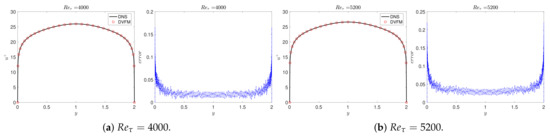 The mean velocity (left) and the pointwise difference between the numerical solution and the DNS data (right) in each sub-figure.