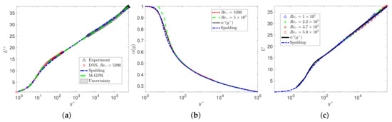Predictions of the mean velocity profile for the superpipe flow from : (a) velocity profile reconstructed from the experimental data (△,28]), DNS data at (□,22]), and the Spalding profile (blue line [23]) using multifidelity Gaussian process regression (M-GPR); (b) “- -”, fractional order with the M-GPR profile at ; “-”, the profile of Equation (24); and ‘-·’, the corresponding Spalding profile; (c) velocity profiles solving the forward fractional model and the Spalding curve against the experimental data.