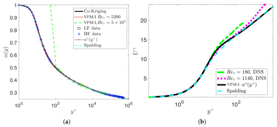 VFM-I for turbulent pipe flow: (a) “”, VFM-I model with the channel flow DNS data at ; “- -”, VFM-I model with the M-GPR profile at ; “-”, the profile of Equation (24); and ‘-·’, the corresponding Spalding profile; (b) ‘-·’ and ‘’ plot the DNS data at and ; ‘-’ the VFM-I model at and the corresponding Spalding profile.