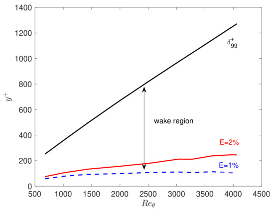 Then, we test if the mean velocity of the boundary layer problem exhibits any universality as the channel and pipe flow. We solve the forward boundary layer problem with the fractional order predicted by Equation (24) (i.e., the formula is the same as the channel flow case) including the wake region. Figure 17 presents the mean velocity profiles from the DNS [34] and fractional modeling near the wall for several from 670 to 4060, with the corresponding varying from 252 to 1200. We observe that the mean velocities are different in the wake region for different . Figure 18 plots the wake region, which is between and the error . We define this error as the difference in the mean velocity between the DNS data and the fractional model as follows: