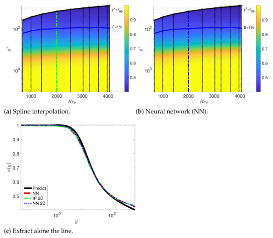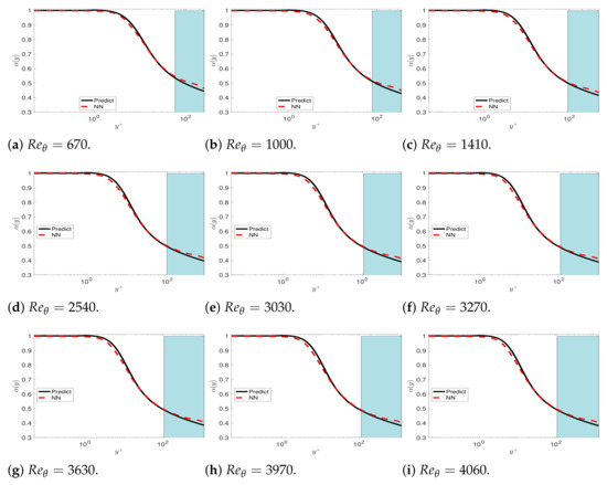 with . Figure 11 plots the solutions (left) of the above equation and the pointwise error (right) of the mean velocity in each subfigure for several . We can observe that this model predicts the mean velocity well. Moreover, it can obtain a smooth mean velocity profile in the whole domain along the wall-wise direction.