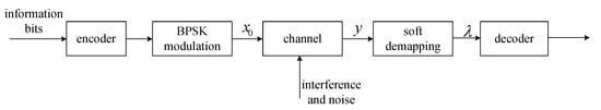- Ayyar, A.; Lentmaier, M.; Giridhar, K.; Fettweis, G. Robust initial LLRs for iterative decoders in presence of non-Gaussian noise. In Proceedings of the 2009 IEEE International Symposium on Information Theory, Seoul, Korea, 28 June–3 July 2009; pp. 904–908. [Google Scholar]