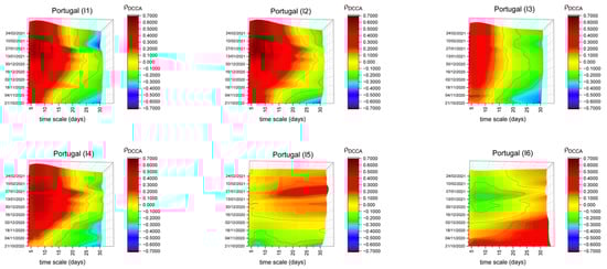 If we consider the retail and recreation index (I1) (see Figure A2), in general, all districts in the country show a similar correlation pattern with the national results. This pattern is characterized by a lower correlation at the beginning of the sample period, increasing gradually until its peak at the beginning of 2021. Despite this similar pattern, it is important to mention districts such as Beja, Bragança, Évora, Faro, Guarda and Portalegre, in which the correlation intensity is lower than that found for Portugal, as seen in Figure 2. Excepting Faro, these districts are located in inland (and more rural) regions which have lower population density levels, in line with Reference [30]. Another district that we consider relevant to include is the Lisbon district. Between mid-November and early February, high correlation levels are observed for the different timescales. This evidence contrasts with that observed at the national level, which shows higher correlation levels for the same period, mainly for short timescales. This behavior may reflect the greater confluence of people in this type of space, not only in the period leading up to Christmas and New Year (for the traditional festive season shopping) but also in the period that followed (taking advantage, for example, of the traditional sales season). The fact that high levels of correlation are observed for longer timescales may indicate the need for restrictive measures to be adopted earlier.