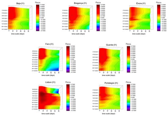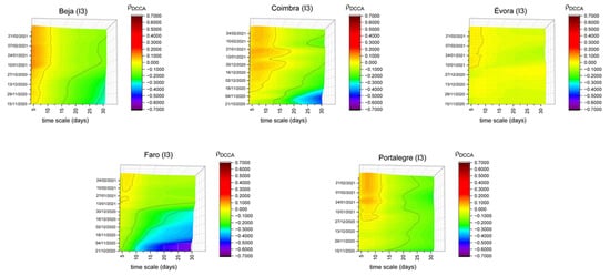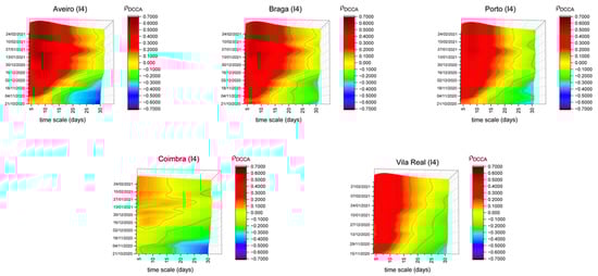 Comparing the results in workplace mobility (I5), it is possible to distinguish a different pattern of correlations mainly in Évora and Castelo Branco, as represented in Figure 6. These are the only districts with significant differences throughout the period under analysis for the different timescales, showing a positive correlation between this index and new COVID-19 cases. This could be related to less efficient security measures in workplaces or the fact that they were adopted later.