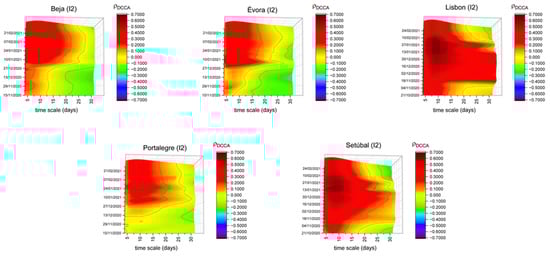 Regarding Lisbon and Setúbal, between mid-November and early February, high correlation levels are observed for the different timescales. Contrary to that stated for the Beja, Évora and Portalegre districts, Lisbon and Setúbal are districts with high population density, which may justify the observed behavior. Furthermore, it could also be justified not only by the high number of this kind of space but also by the increase in the number of people who go to those places. This could lead us to think that the adoption of different measures (more restrictive in this case) should be considered.
