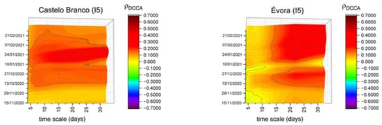 DCCA correlation coefficients between workplace mobility (I5) and new COVID-19 cases in Castelo Branco and Évora.