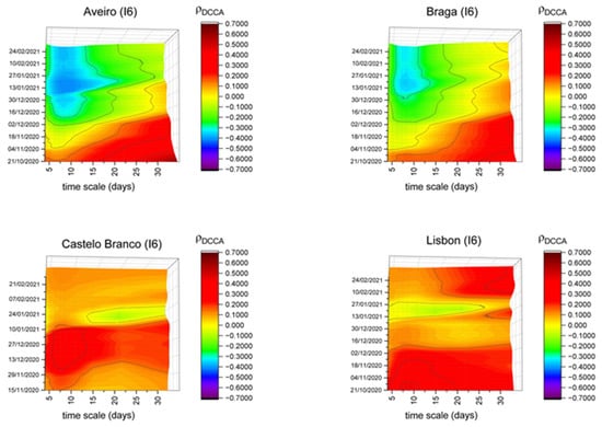 Finally, considering the residential areas (I6) index, Figure 7 shows the patterns registered in Aveiro, Braga, Castelo Branco and Lisbon, although with different patterns. Aveiro and Braga show the highest negative correlations after the confinement of the beginning of 2021, probably meaning that the success of the lockdown was greater in those districts. Regarding Castelo Branco and Lisbon, these districts are the only ones showing a positive correlation over the entire sample period, mainly in short timescales. This may indicate that, in these districts, the family nuclei could have caused an emergence of new COVID-19 cases, although with different possible explanations. Lisbon is the most populous district of the country and in some cases the quality or undersized dimensions of the habitations could promote the increase of contagion. On the other hand, in the case of Castelo Branco, the situation could be related to an existent gap between the beginning of the cases in this district and the rest of the country. For example, when the first confinement occurred, Castelo Branco had practically no COVID-19 cases, meaning that people had no necessity to go to their houses, i.e., confinement could be considered unnecessary in the district.