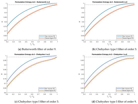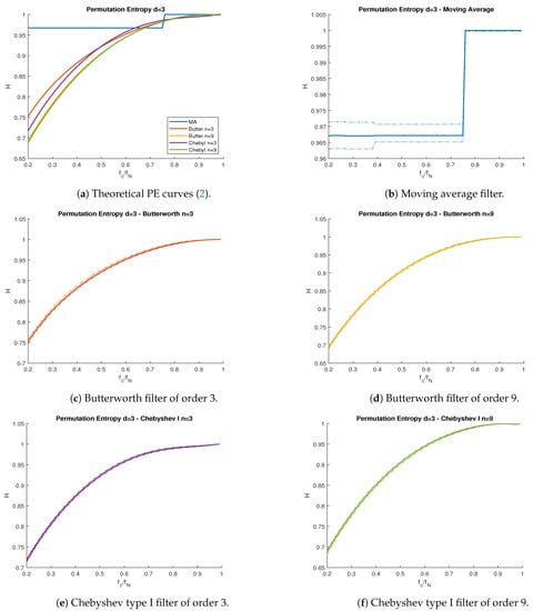 The results shown in Figure 1b correspond to the theoretical predictions using Equations (2) and (13). We observed that the lowest PE curves corresponded to filters with narrow bandwidths, since few frequency components imply a signal with low complexity.