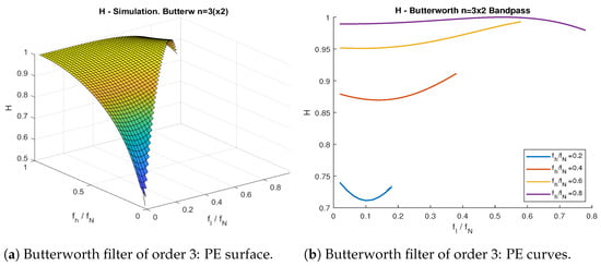 For all types of filters, the theoretical PE (2) curves lied between the confidence interval obtained from the simulations, at 95% confidence. As a general trend, all curves presented lower levels of PE when we reduced the passband bandwidth. This is straightforward to see for lowpass and highpass filters. Nonetheless, the bandpass filters’ PE curve is more difficult to interpret. Lower f h values led to lower PE values, but variations of f l did not necessarily lead to monotonic changes in PE. This implies both the passband frequency range and the actual frequency values play an important role in the filter’s information content.
