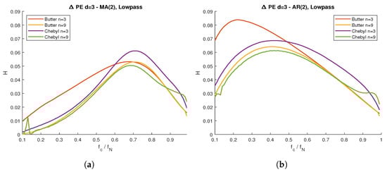 Figure 8. Difference between the filters’ intrinsic PE and filtered ARMA time series, with respect to the normalized cutoff frequency: (a) MA(2) series with lowpass filters; (b) AR(2) series with lowpass filters. We applied Butterworth (order n = 3 and n = 9) and Chebyshev type I (n = 3 and n = 9) filters, for each case.