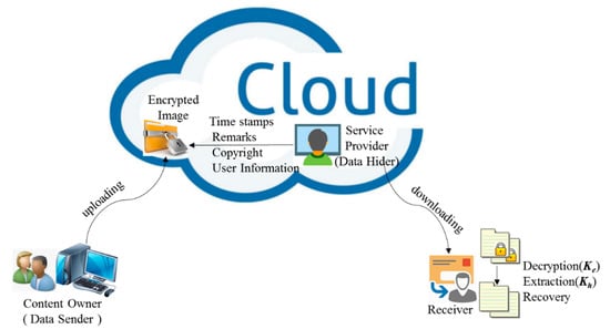 With the growing maturity of cloud storage and cloud computing technology, data storage, image processing and other work has been transferred from local to cloud server. More and more data are uploaded to the cloud to be broadly shared, efficiently processed, stored centrally, or authenticated by a third party for the data source. In order to protect cloud stored data and user privacy, data will be encrypted before it is sent to the cloud server. For example, in the process of telemedicine, when the local hospital sends the patient’s medical image to the remote hospital through the network, the medical image needs to be encrypted before it is sent through communication channel to the cloud so that the patient’s privacy can be protected. At this time, the channel service provider may need to embed verification information in the transmitted data. As you can see from this example, the person who uploads the image, what we technically call the content owner, may want to upload encrypted images instead of plaintext images before adopting the functions offered by the cloud platforms. Encryption technology [15] can transfer the plaintext image into a meaningless image that is unrecognizable to the naked eye or even to powerful algorithms run in machines, which is technique we can apply in this scenario. Moreover, for the sake of management, some information such as owner information, timestamp, tagging, and source information of the encrypted media may need to be embedded into the encrypted image by service provider, also called as data hider. When needed, the user, more technically known here as the receiver can download the marked encrypted image to get the hiding message and original image with keys, as described in Figure 1. To achieve security and reversibility of the secret message, the RDH scheme is required to work on the encrypted image, which is called reversible data hiding in encrypted images (RDHEI) technique. RDHEI technique embeds the secret information into the encrypted image rather than the plaintext image, and the embedded secret information can be extracted correctly, along with the original plaintext image being recovered without loss. Therefore, RDHEI technique has the advantages of both RDH and encryption, realizing multimedia data privacy and copyright protection, content integrity authentication and ciphertext management, which is a research direction of intersection of data hiding and privacy protection.