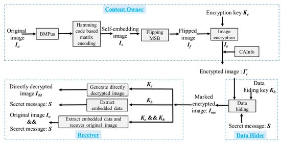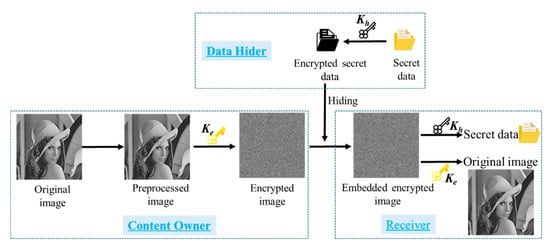 Due to the correlation of adjacent pixels that are damaged during the encryption processing, the hiding capacity of VRAE methods are relatively low in most cases and may encounter some errors in the procedure of data extraction and image recovery. In order to deal with such misjudgment problems, Ma et al. [19] proposed an RRBE method by reserving room before encryption. In their method, the original image is first divided into two parts: the smooth area and complex area. Then, standard RDH algorithms are applied to embed two or more LSB planes of the complex part into a smooth part to reserve room before encryption. After that, the preprocessed image is encrypted to generate the encrypted image. The vacated room of LSBs in complex parts can be applied for embedding a secret message. On the basis of the original algorithm, Mathew et al. [20] improved Ma et al.’s method in ER and PSNR, mainly adding the steps of dividing the original image into small blocks and classifying the small blocks into smooth blocks and complex blocks. In [21], Zhang et al. introduced a lossless, a reversible, and a combined data hiding scheme for ciphertext image encryption based on public-key cryptosystems with probabilistic and homomorphic properties. In the lossless scheme, the embedded data can be extracted directly from the encrypted image, and the embedding of the data has no effect on the decryption of the original plaintext image. In the reversible scheme, embedded data can be extracted, and the original image can be recovered from the directly decrypted image. Combined with these two schemes, the receiver can extract part of the embedded data before decryption, and extract another part after decryption, and restore the original plaintext image at the same time.