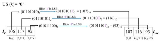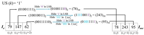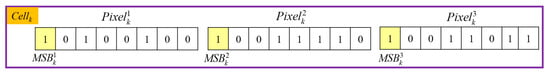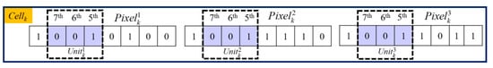 Then we define a utility function called the US function to measure the smoothness of each cell based on the cell structure depicted in Figure 4. For each pixel, its 7th to 5th bits are selected as a unit. Three determined units are compared with each other to generate the US value according to Equation (2) for a given Cellk: