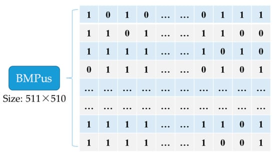 where the US function is used to determine whether a cell is smooth or not, and means to fetch the 7th to 5th bits of to form a 3-bits binary unit. As described in Figure 4, = = ‘001’, = ‘001’, = ‘001’, and the conclusion can be drawn that = = . According to the definition of US in Equation (1), the function result of is ‘1’ in this case. On this occasion, and can be cleared and used to embed a secret message without any worry about not being able to recover, because has saved their values. A BMPus is used to indicate if the corresponding unit is smooth or not is generated, as demonstrated in Figure 5, where ‘1’ represents .