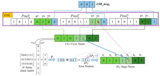 Step 3. Obtain error position (EPk) after encoding LSBmsgk into CWk by Equation (4). Finally, the bit value located at EPk is flipped in CWk to generate a stego codeword :