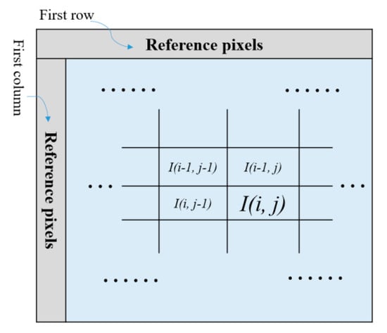 Example of reference pixels, the current pixel, and its three neighboring pixels.