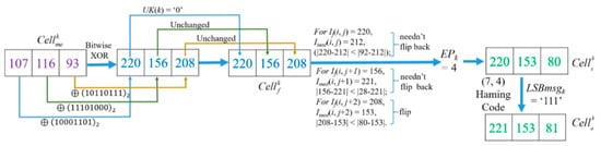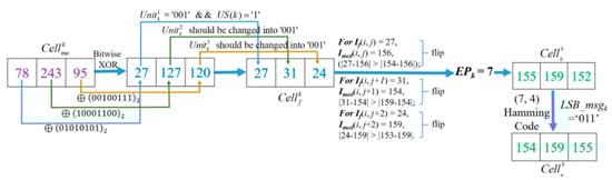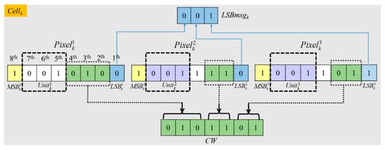 Here every cell has three units , , and , and a unit consists of the 5–7th bits of a pixel, as shown in Figure 9. The first part of vacated room is 6-bits, which are derived from the latter two units and in a cell when three units in the cell have the same values. That is and colored in purple Figure 9. The second part of vacated room is 3-bits, which is the collection of the LSBs of three pixels in Cellk. It will be used to hide CAInfo and a part of secret message. To save the original value of the threes LSBs in Cellk, which are called LSBmsgk, the self-embedding method based on the (7, 4) Hamming Code described in Section 3.2 are applied. During the procedure, the combination of the 4th–2nd bits of the first pixel and the 3rd–2nd bits of the second and third pixels are combined and named as CW then used to carry LSBmsgk.