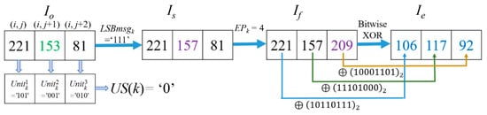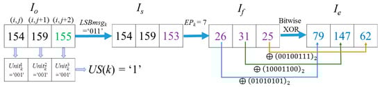In this case, the 7th, 6th, and 5th bit of Io(i, j), Io(i, j + 1) and Io(i, j + 2) constitutes , and , respectively. Because the three units are equal, the corresponding US(Cellk) = ‘1’. This means the last two units and of Cellk can be applied to hide secret data. The LSBs of the three pixels is ‘0’, ‘1’, and ‘1’; therefore, LSBmsgk = ‘011’. CW = ‘1011101’ is formed by those bits at the specified location, which are the 4th, 3rd, and 2nd bit of , 3rd and 2nd bit of , and 3rd, 2nd bit of . After conducting data hiding based on the (7, 4) Hamming Code, = b7, which means the 2nd bit of the value should be flipped. After the flipping operation, CW is encoded into = ‘1011100’. Thus, Is(i, j) = Io(i, j) = 154, Is(i, j + 2) = 153. Note that only the last bit of the three pixels in Cellk is changed. Due to EPk = 7, according to Equation (3), flipping () of the three pixels in Is is selected according to flipping rules listed in Table 1. Thus, the flipped pixel values If(i, j) = 26, If(i, j + 1) = 31, If(i, j + 2) = 25 are obtained. Imed(i, j) = 156, Imed(i, j + 1) = 154, Imed(i, j) = 159. Thus, , which is the comparison result of the two difference values between the MED prediction value Imed(i, j) and the values before and after flipping the MSB of Is(i, j). Obviously, it corresponds to the general case, so their coordinates and MSB values will not be recorded as mentioned in Section 3.4. The other two pixels in Cellk are also the general case. Finally, after the XOR operation, the three encrypted pixels in Cellk are derived as Ie(i, j) = 79, Ie(i, j + 1) = 147 and Ie(i, j + 2) = 62, as shown in Figure 10.