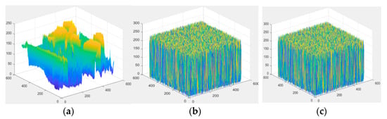 The 3D distribution of pixel values of ‘Lena’ image. (a) The original image; (b) the encrypted image, and (c) the marked encrypted image.