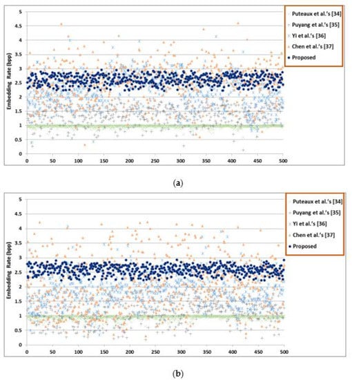 Table 5 shows the maximum ER comparisons of different images using the proposed HUD-RDHEI scheme and some state-of-the-art methods. Table 6 shows the average ER comparisons of different images based on 20,000 images from BOSSBase and BOWS-2 using the proposed HUD-RDHEI scheme and some state-of-the-art methods. The results show that the ER of our proposed algorithm is greatly improved than closely related state-of-the-art methods. In order to intuitively and visually see the difference of the ER distribution between the proposed HUD-RDHEI scheme and other algorithms, we randomly chose 500 images from two image datasets and generate the ER value of each image with five algorithms using a scatter diagram, as shown in Figure 19. It can be seen that the ER value of the scheme proposed by this algorithm is uniformly distributed, which is generally higher than other algorithms, and most of the values are very close to 3, regardless of if they are smooth or complex images. Although the algorithm from Yi et al.’s PBTl-RDHEI [36], and Chen et al. [37] have a higher ER on some pixels, this is with a very low percentage. Especially when we use the images in these two databases, each database has 10,000 images, to demonstrate the superiority of our algorithm over the other four algorithms on ER, as shown in Table 6. In summary, this scheme is obviously better than the four latest algorithms in terms of ER.