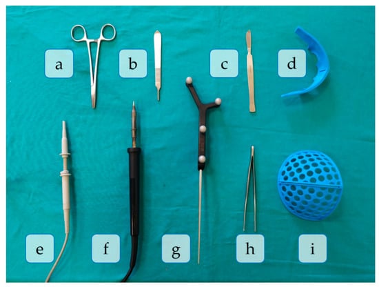 Surgical tools used in the study. (a) Scissors; (b) Osteotome, (c) Scalpel, (d) SO guide, (e) Motor, (f) Handpiece, (g) Pointer, (h) Forceps, (i) FT guide.