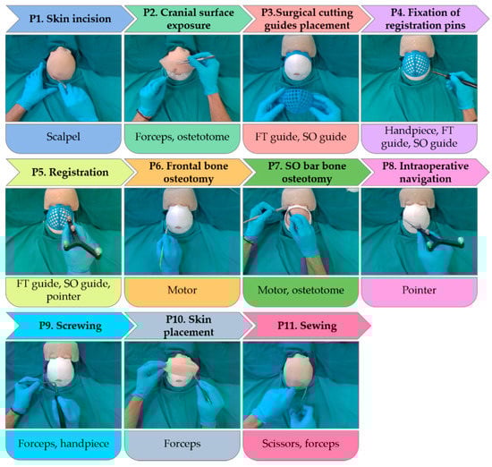 The surgical procedure was divided into eleven different phases, according to the activity conducted and tools used in each one. A total of nine tools were necessary for this surgical simulation, namely: scalpel knife (scalpel), osteotome emulator (osteotome), claw dissection forceps (forceps), supraorbital surgical cutting guide (SO guide), frontal surgical cutting guide (FT guide), emulator of a SonicWeld Rx (handpiece), tracked tool (pointer), emulator of a surgical ultrasonic bone-cutting device (motor) and scissors. All these tools are depicted in Figure 1 and employed in each surgical phase as explained below: