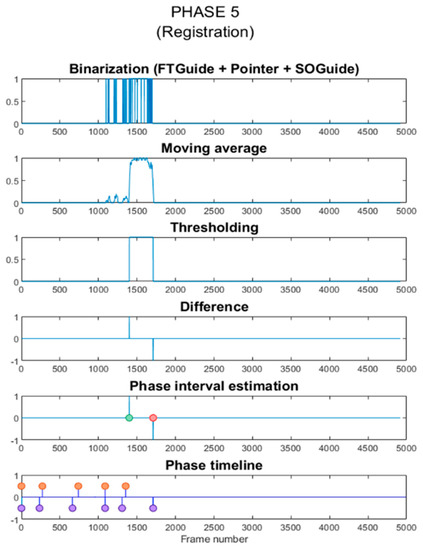 Each workflow phase is defined by the tools present in the surgical field at that moment (right-phase tools). We analyzed the CSV file and created a temporal binary signal with 1s when the right-phase tools were detected and 0s when there were other tools in the FOV (wrong-phase tools). We then applied a moving average filter to smooth the signal, thresholding the result to obtain binarized data. A difference vector is calculated to detect the beginning and end of the batches of 1s. Temporal information was used to identify the beginning of the phase. This means that every new phase must start after the end of the previous phase. Consequently, hits before that time are automatically discarded. The duration of the phase was determined by the length of the first batch of 1s after that moment. The interphases’ limits are estimated averaging the end peak of the previous phase and the start peak of the new one. This process is represented in Figure 3, on which P5 is estimated from the results obtained using the InceptionV3 model.