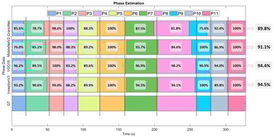 Figure 4 shows the percentage of ground truth phase detected for each individual phase and model. InceptionV3 and VGG16 achieve the best results, with an average phase detection of 94.5% and 94.4%. MobileNetV2 achieves a result of 91.1% and CranioNet 89.8%.