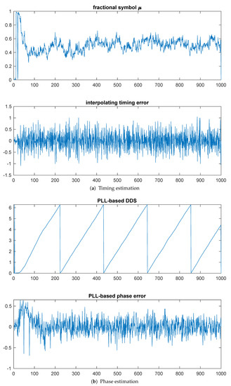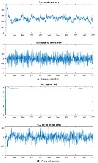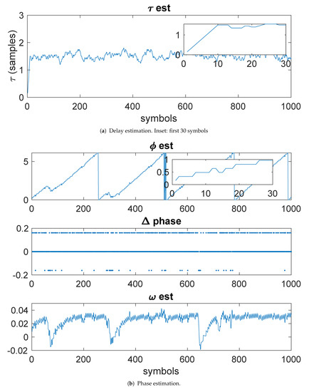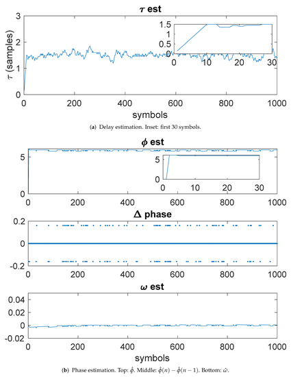 Figure 6a shows the results of the delay estimation. The inset in the figure shows the first 30 samples, illustrating that convergence occurred in less than 20 symbols.