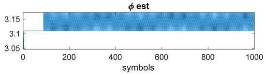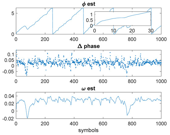 Figure 6b shows the phase estimation. The phase estimate (top, in radians) shows the phase estimate. The inset shows that the phase estimate converged in less than 10 symbols. The