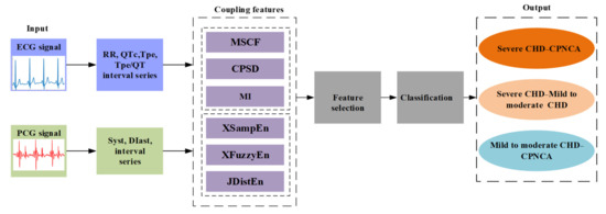 Generally, the common methods of coupling information analysis include coherent function [8,9], cross power spectral density (CPSD) [10], mutual information (MI) [11], phase synchronization [12], multiscale cross approximate entropy [13], cross fuzzy measure entropy [14], and joint symbolic dynamics analyses [15]. Peng et al. [16] utilized cross-recursive quantitative analysis to study the RR interval (RRI)–QT interval (QTI) series of electrocardiogram (ECG) signals in patients with acute myocardial ischemia and found that the complexity of the RRI–QTI series was reduced and the coupling between the two series was weakened during acute myocardial ischemia. Oivasse et al. [17] used correlation coefficients to analyze the dynamic coupling between the RRI and Tpeak–Tend interval (TpeI) series of ECG signals in athletes and healthy subjects. Among numerous coupling analysis methods, entropy-based methods have obtained better results. Li et al. [18] proposed joint distribution entropy (JDistEn) to analyze the coupling between RRI of ECG signals and diastolic time interval (DTI) series of radial artery pressure pulse signals in patients with heart failure, and the results proved that JDistEn has an excellent performance in detecting coupling characteristic. Zhao et al. [19] applied multivariate fuzzy measure entropy to analyze the coupling characteristics between RRI series of ECG signals and S1 and S2 amplitude series of phonocardiogram (PCG) signals under different motion states, and the results proved that the multivariate fuzzy measure entropy method has strong statistical stability and discriminant ability. Furthermore, Ji et al. [20] used linear and nonlinear methods to evaluate the coupling characteristics between the RRI series of ECG signals and the systolic time interval (STI) and DTI series of photoplethysmography signals. They concluded that the cross fuzzy entropy (XFuzzyEn) could better evaluate the differences in the coupling characteristics between CHD patients and healthy subjects. However, in clinical practice, it is more necessary to correctly identify patients with varying degrees of coronary artery stenosis and then give targeted treatment regimens [21]. At present, there has been no relevant research on the combination of multiple coupling analysis methods to more effectively mine cardiac mechano-electric coupling information to distinguish patients with varying degrees of coronary artery stenosis, or on the comparison between entropy-based methods and other coupling analysis methods.