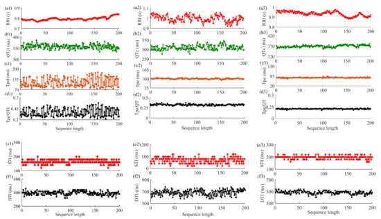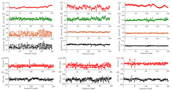 In addition, the severe CHD patient in Figure 4 also had arrhythmia, and the changes of c1 and d1 series may also be related to the influence of arrhythmia. Studies have shown that the change of QT variability (QTV) may be the combined result of the change of QTV itself and the influence of HRV [57]. Even though Bazzett’s method was used to correct QT in this study, some studies have shown that there is lag in the impact of HRV on QT change [57], which makes the relationship between QT and HR more complicated. In addition, the variability of QT and Tpe series is also influenced by circadian rhythm factors, and the prolonged duration of QT and Tpe interval is more significant in people with hypertension, obesity, and smoking [58]. Meanwhile, compared with Figure 3 and Figure 4, the interval series of ECG and PCG signals were affected by noise and artifacts, so the step of fiducial points correction is particularly important.
