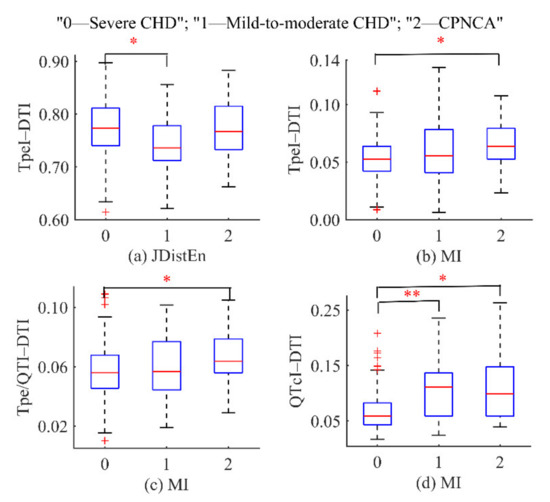 For coupling feature sets, the normality of the distribution was evaluated by the Kolmogorov–Smirnov test. The one-way ANOVA test approach was used for data with normal distribution, and the post hoc test was adopted for multiple comparisons. Otherwise, the Kruskal–Wallis H test (multiple independent samples) was used. Then, the Bonferroni criterion was employed to correct the multiple comparisons, and the significance level was set at 0.05. The coupling series with significant differences among different groups are shown in Figure 5. It can be seen that the coupling feature of the TpeI–DTI series extracted by the JdistEn algorithm was significantly different in the severe CHD–chest pain and normal coronary angiography group. Then, for the MI algorithm, the coupling features of the TpeI–DTI, Tpe/QTI–DTI, and QtcI–DTI series were significantly different in the severe CHD–chest pain and normal coronary angiography group. The coupling feature of the QtcI–DTI series was significantly different between the severe CHD–mild-to-moderate CHD group.