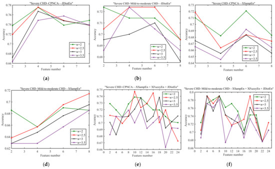 Since the numbers of patients in the severe CHD group, mild-to-moderate CHD group, and chest pain and normal coronary angiography group were 114, 37, and 40, respectively, the sample proportion was unbalanced, and the analysis results of the severe CHD–chest pain and normal coronary angiography group and the severe CHD–mild-to-moderate CHD group would be affected. Here, an appropriate sample weight coefficient needed to be specified in the XGBoost algorithm to mitigate the impact of sample imbalance on the classification results. The JdistEn and XsampEn algorithms had the best classification accuracy in single algorithm analysis, and the combined analysis of XsampEn, XfuzzyEn, and JdistEn had the best classification accuracy in joint algorithm analysis. Figure 6 illustrates the optimal classification results of different weight coefficients in the verification set for single and joint algorithm analysis. It can be seen that for XsampEn analysis of the severe CHD–chest pain and normal coronary angiography group, the weight coefficient w was set to 2, and the classification accuracy was optimal. In other cases, the classification accuracy was optimal when the weight coefficient w was set as 2.5. Therefore, the weight coefficient w was set as 2.5 in the subsequent analysis.