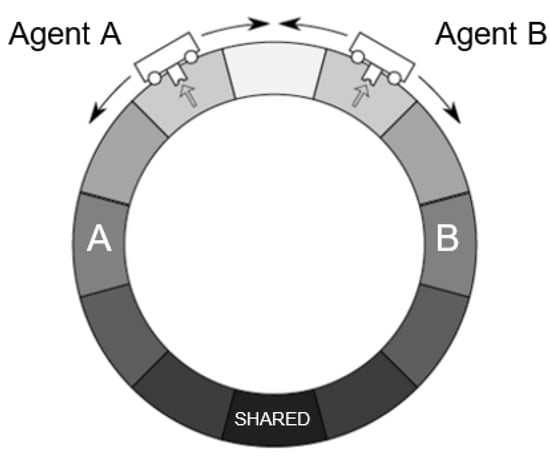 70]. To ensure that the agent behavior is not an artefact of their specific location in the environment, we run 180 runs for each simulation for each experimental condition by randomizing their starting locations throughout the environment. The environment size was held constant at 60 cells. To ensure that the agent behavior is not an artefact of initial conditions, we perform 180 runs for each simulation for each experimental condition by uniformly distributing their starting locations throughout the environment (three times per location), while preserving the distance between starting locations and target. This uniform distribution of initial conditions across the environment also corresponds to the “worst-case scenario” in terms of system-level specification of sensory inputs for a two-agent system, discussed in