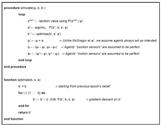 In this paper, we will not cover the “active” part of active inference at the global level—namely, the system action remains undefined. We will instead consider a single system-level inference step, corresponding to fixed values of ,. As we can see from the formulation above, this corresponds to optimizing given —that is, to the aggregate behavior of the 2M agents’ over an entire run of the model at the individual level.