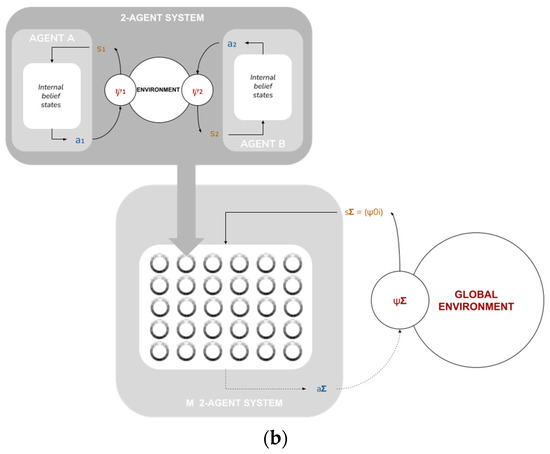 9] or by constructing a scenario in which the emergence of a superordinate agent at the global scale is predestined by limiting an agent’s model of the environment to sensory evidence generated by a counterpart agent [