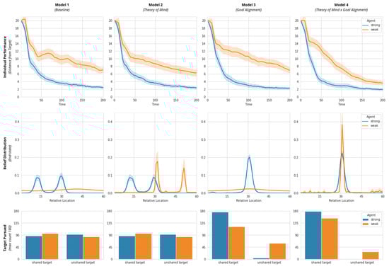 Model 4 includes both cognitive features: self- and partner-actualization loops for the weak agent (instantiating ToM; alterity = 0.2) and complete goal alignment between agents.