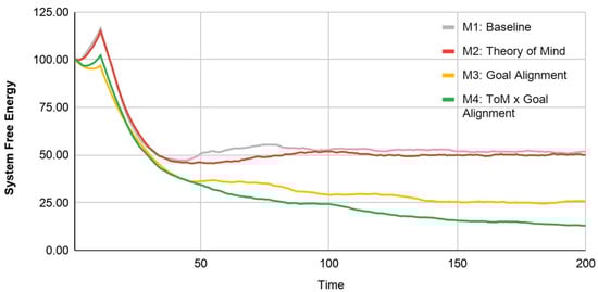 69]). In a series of four models, we demonstrate the responsiveness of this system-level measure to learning effects over time; the progression of each Model exhibits a pattern akin to a gradient descent on free energy, evoking the notion that a system that performs (active) Bayesian inference. Further, stepwise increases in cognitive sophistication at the individual level show a clear reduction in free energy, particularly between Model 1 (Baseline) and Model 4 (Theory of Mind x Goal Alignment). These illustrative results suggest a formal, causal link between behavioral processes across multiple scales of a complex adaptive system.