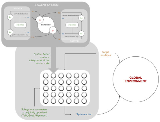 Going further, we can imagine an extension of this model where the collective system interacts with a non-trivial environment, but at a slower time scale, such that a complete simulation run of all 2M agents corresponds to a single belief optimization step for the whole system, after which it acts on the environment and receives sensory information from it (manifested, for example, as changes in the agents’ food sources). In this extended model (see