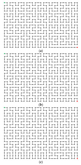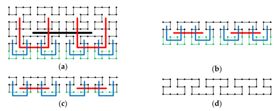 Figure 6 shows a specific example of how the 4th order Hilbert curve is reduced by . In Figure 5a, the original 4th order Hilbert curve is shown. Reductions on by 8, 4, and 1 in each step are respectively shown in Figure 6a–c. After all the sub-reductions are completed, the total reduction of is achieved in Figure 6d.